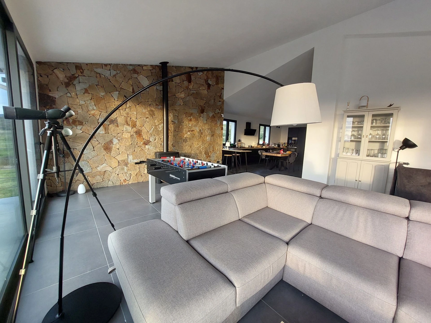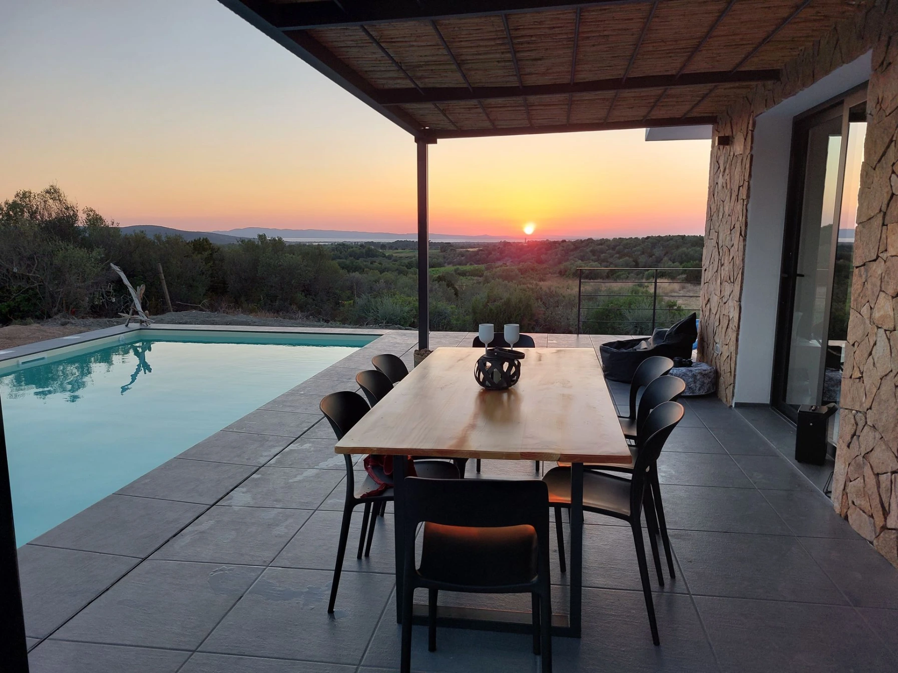 À l’extérieur, la villa offre une superbe terrasse de 150 m² aménagée avec piscine, pergola, transats et une cuisine d’été couverte, parfaite pour profiter des repas en plein air. La vue panoramique sur la mer et les couchers de soleil est tout simplement exceptionnelle.